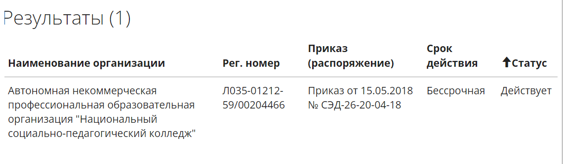 АНПОО «НСПК» — колледж с бессрочной лицензией. Проверить ее можно в реестре лицензий федеральной службы по надзору в сфере образования и науки: введите в поле «ИНН» ИНН колледжа — 5904354193 — и нажмите «Поиск».
