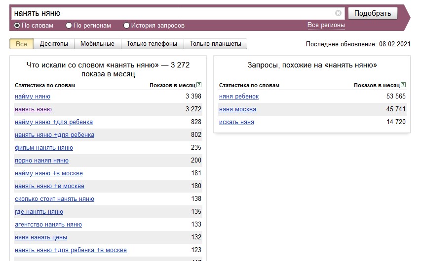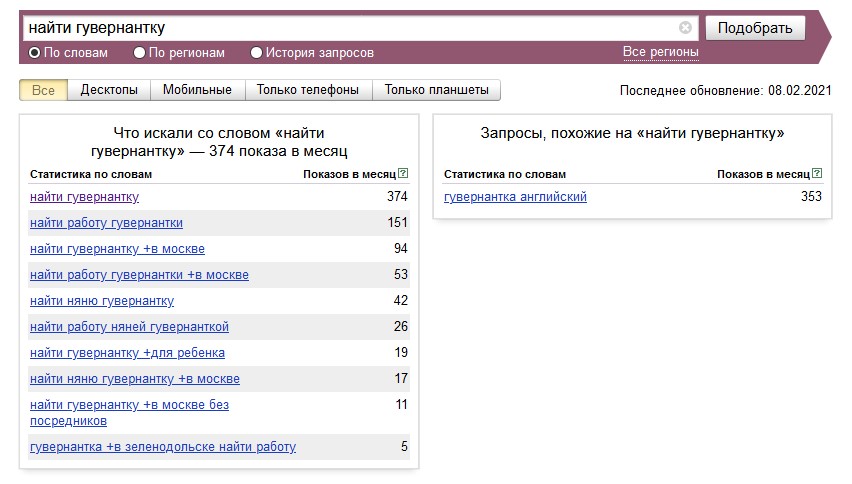 Специалист может предоставлять услуги гувернера или няни. По данным сервиса Yandex.Wordstat, запрос «найти гувернантку» вводят в поисковой системе Яндекс 374 раза в месяц, а «нанять няню» — 3 272 раза.